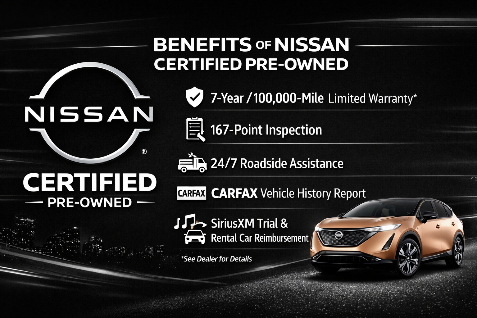 Our Certified Pre-Owned Nissan vehicles meet higher standards for quality, condition, and reliability.